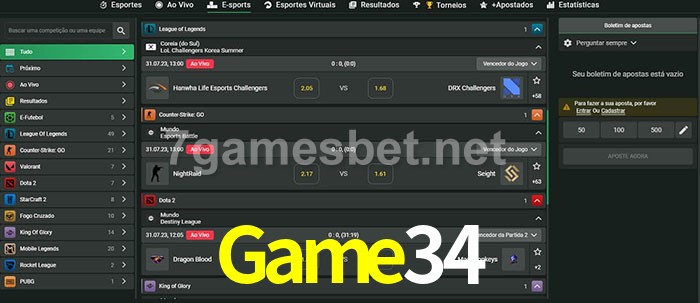 O Game34 oferece uma grande seleção de opções de apostas em e-sports com probabilidades competitivas